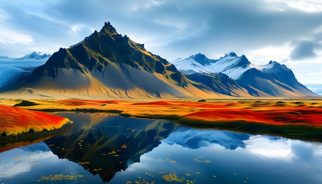 高耸入云的山峰与广阔的秋季色彩相映成趣,展现自然的壮丽。