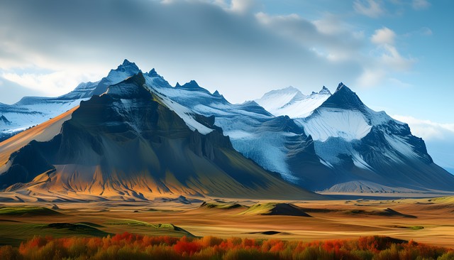 高耸入云的山峰与广阔的秋季色彩相映成趣,展现自然的壮丽。