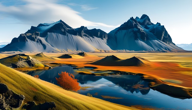 高耸入云的山峰与广阔的秋季色彩相映成趣,展现自然的壮丽。