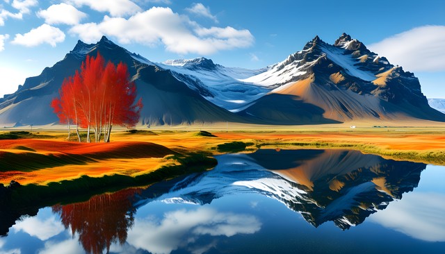 高耸入云的山峰与广阔的秋季色彩相映成趣,展现自然的壮丽。