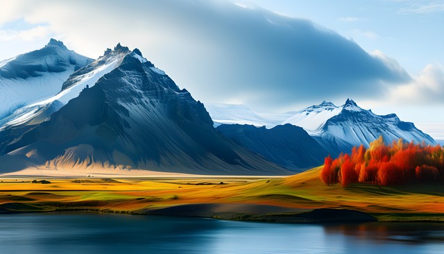 高耸入云的山峰与广阔的秋季色彩相映成趣,展现自然的壮丽。