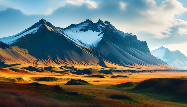 高耸入云的山峰与广阔的秋季色彩相映成趣,展现自然的壮丽。
