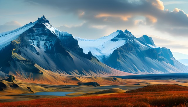 高耸入云的山峰与广阔的秋季色彩相映成趣,展现自然的壮丽。