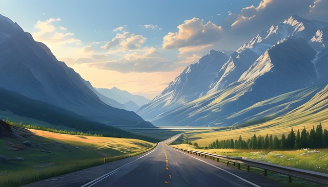 宽阔的公路穿过青翠的山谷与远处的高山,展现出自然的美景。