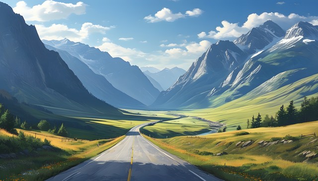 宽阔的公路穿过青翠的山谷与远处的高山,展现出自然的美景。