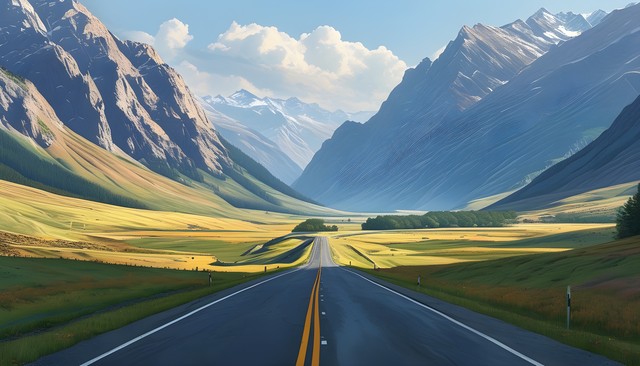 宽阔的公路穿过青翠的山谷与远处的高山,展现出自然的美景。
