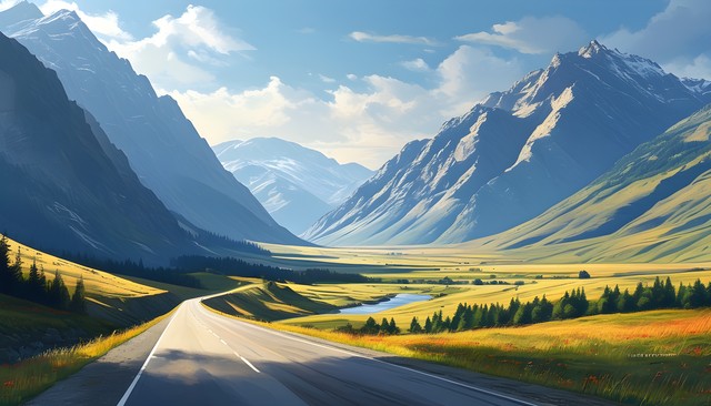 宽阔的公路穿过青翠的山谷与远处的高山,展现出自然的美景。