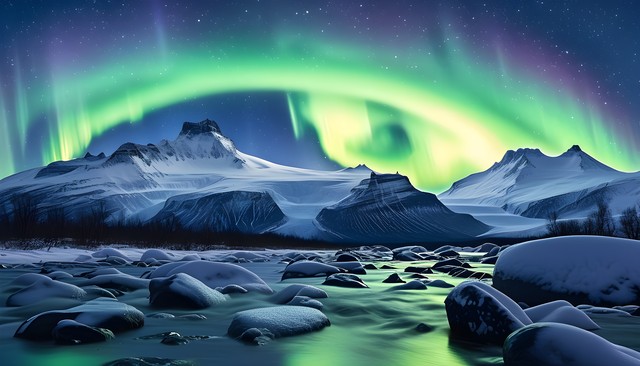 壮丽的冰雪山脉与极光映照的夜空,河流蜿蜒而过,构成一幅唯美的自然风景。