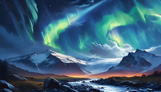 壮丽的冰雪山脉与极光映照的夜空,河流蜿蜒而过,构成一幅唯美的自然风景。