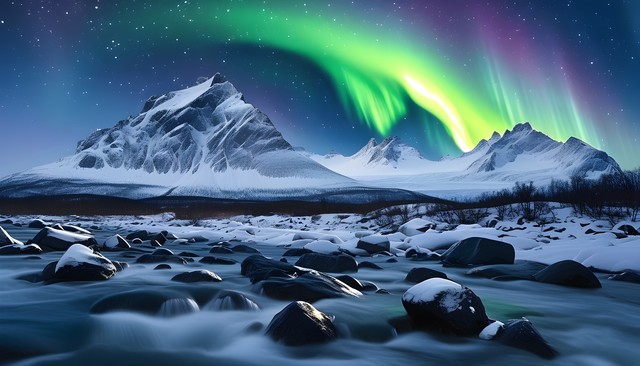 壮丽的冰雪山脉与极光映照的夜空,河流蜿蜒而过,构成一幅唯美的自然风景。