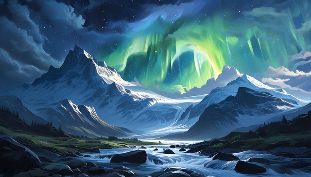 壮丽的冰雪山脉与极光映照的夜空,河流蜿蜒而过,构成一幅唯美的自然风景。