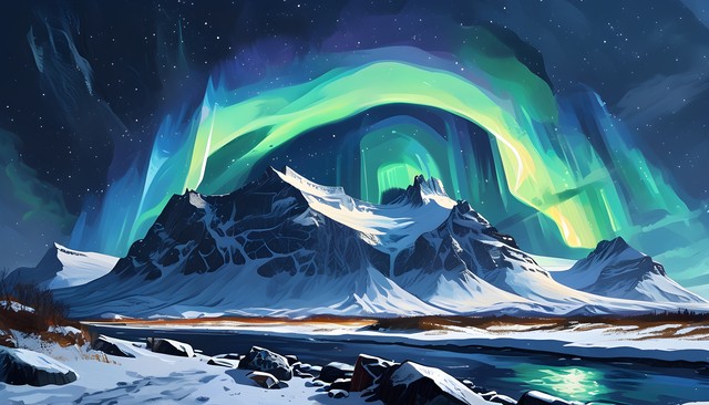 壮丽的冰雪山脉与极光映照的夜空,河流蜿蜒而过,构成一幅唯美的自然风景。