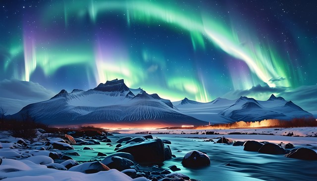 壮丽的冰雪山脉与极光映照的夜空,河流蜿蜒而过,构成一幅唯美的自然风景。