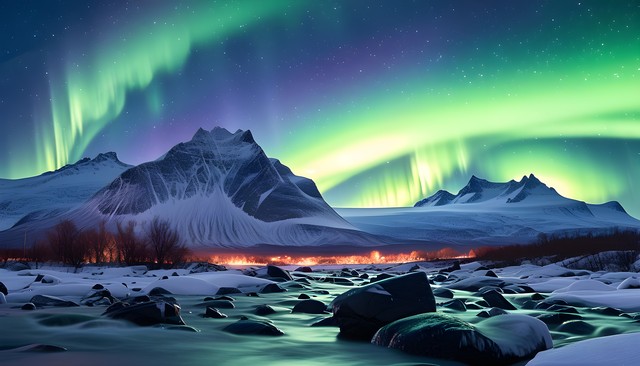 壮丽的冰雪山脉与极光映照的夜空,河流蜿蜒而过,构成一幅唯美的自然风景。