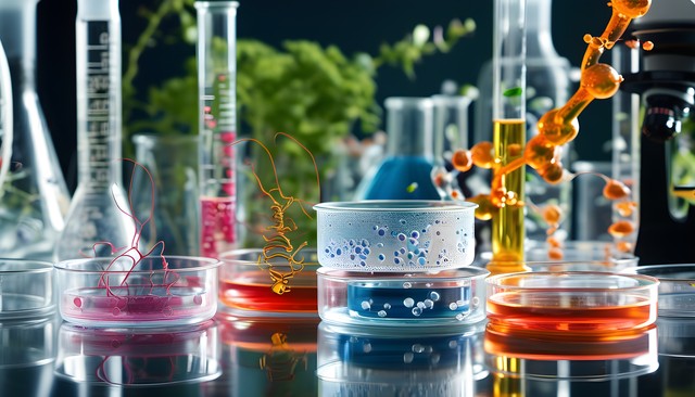 多彩的培养皿与化学试剂,反射出科学实验室的氛围。