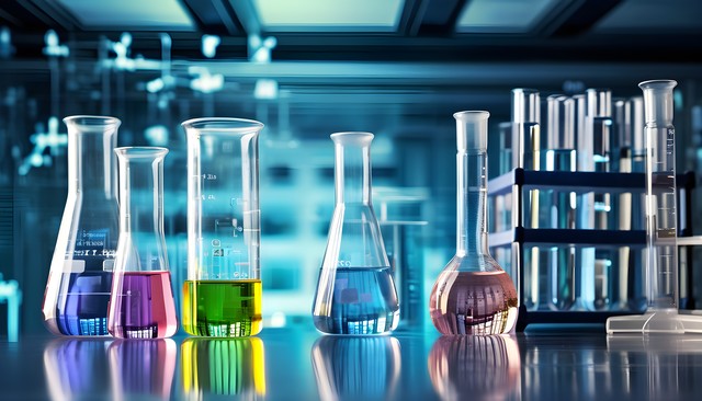 实验室中透明的玻璃器具与科学元素的逼真场景
