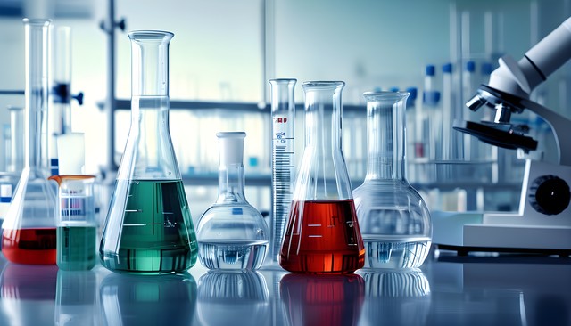 实验室中透明的玻璃器具与科学元素的逼真场景