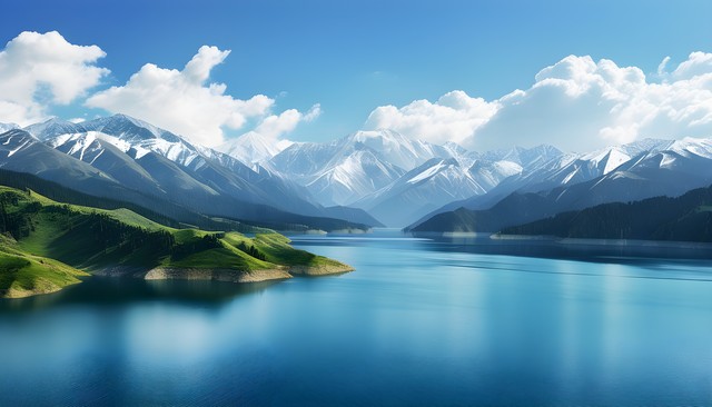 美丽的湖泊与雪山环绕的自然风光,蓝天白云映衬下的宁静景象。