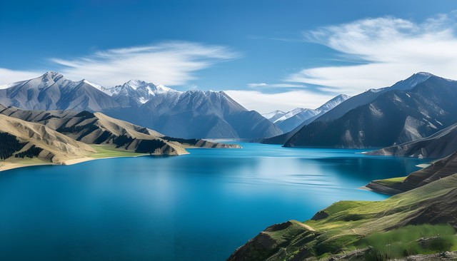 美丽的湖泊与雪山环绕的自然风光,蓝天白云映衬下的宁静景象。