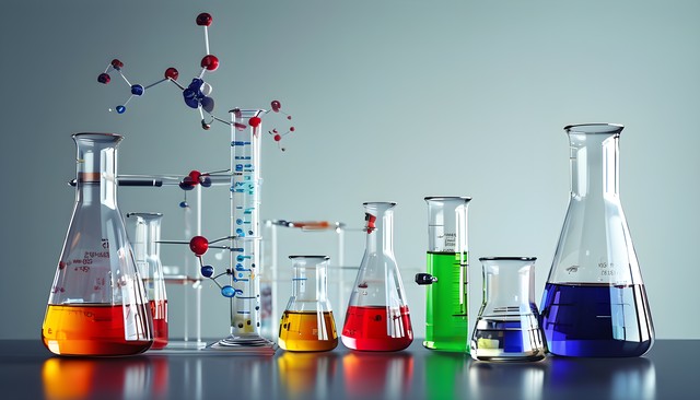 色彩缤纷的实验器皿排列在桌面上,展现出科学实验的氛围。