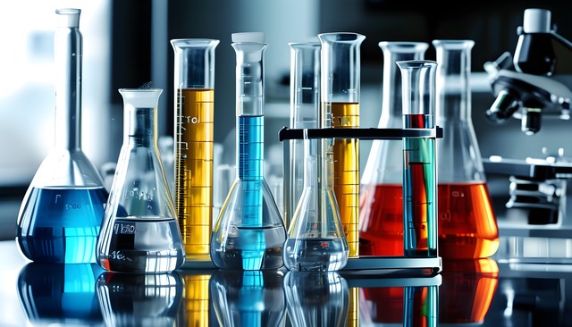 实验室中的各类化学试管与烧瓶,展示多种颜色的液体与科技背景。