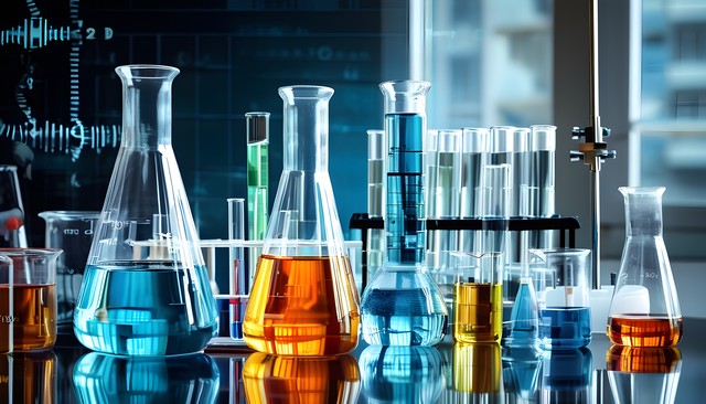 实验室中的各类化学试管与烧瓶,展示多种颜色的液体与科技背景。