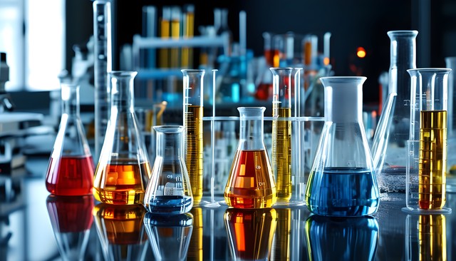 实验室中的各类化学试管与烧瓶,展示多种颜色的液体与科技背景。