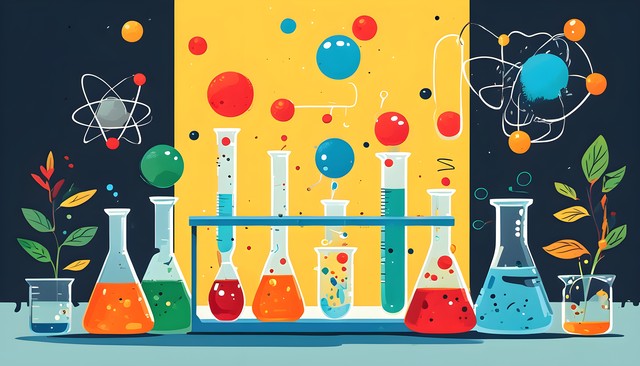 色彩缤纷的实验室器具,象征着化学实验与科学探索的艺术化表现。