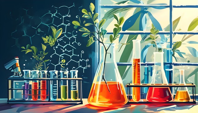实验室中五彩缤纷的化学试剂与植物背景,充满科学氛围。