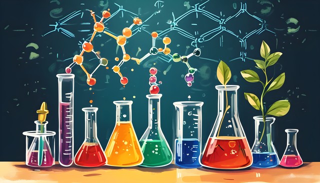实验室中五彩缤纷的化学试剂与植物背景,充满科学氛围。