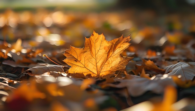 秋天的枫叶在阳光下熠熠生辉,散落的叶子增添了自然的美感。