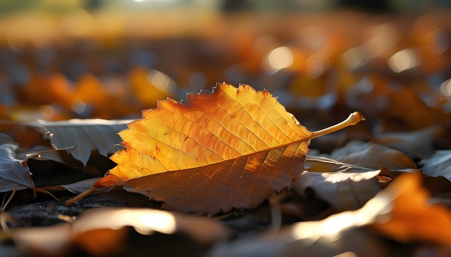 秋天的枫叶在阳光下熠熠生辉,散落的叶子增添了自然的美感。