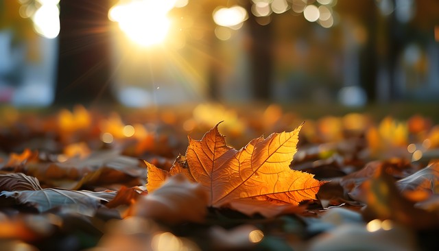 秋天的枫叶在阳光下熠熠生辉,散落的叶子增添了自然的美感。