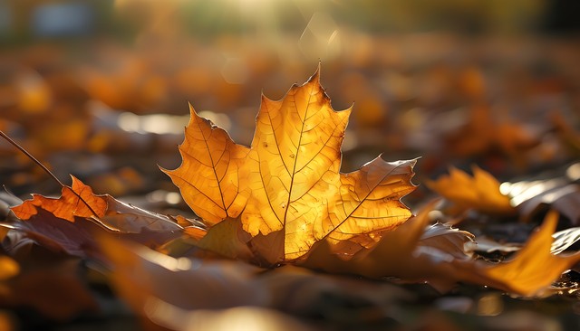 秋天的枫叶在阳光下熠熠生辉,散落的叶子增添了自然的美感。