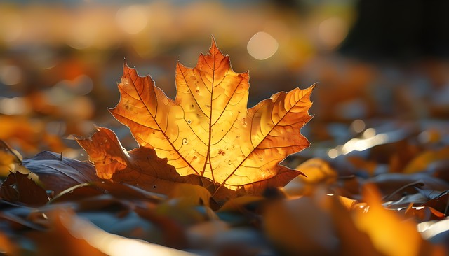 秋天的枫叶在阳光下熠熠生辉,散落的叶子增添了自然的美感。