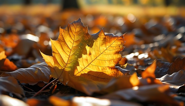 秋天的枫叶在阳光下熠熠生辉,散落的叶子增添了自然的美感。