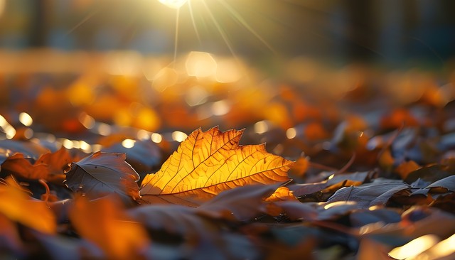 秋天的枫叶在阳光下熠熠生辉,散落的叶子增添了自然的美感。