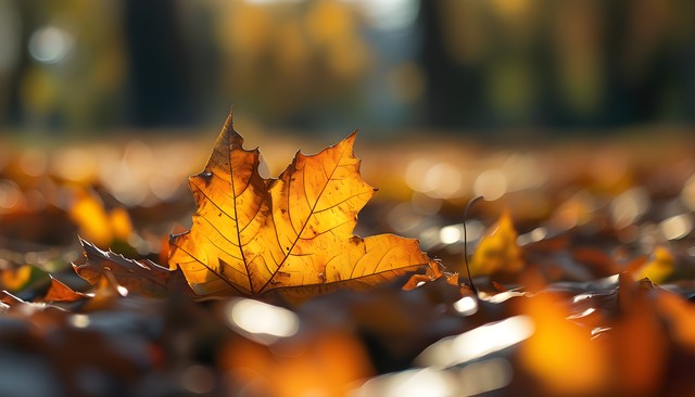 秋天的枫叶在阳光下熠熠生辉,散落的叶子增添了自然的美感。