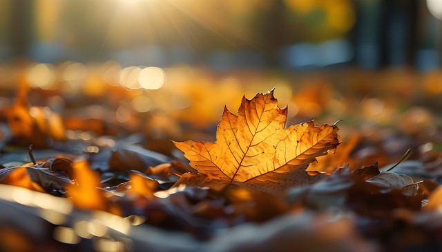 秋天的枫叶在阳光下熠熠生辉,散落的叶子增添了自然的美感。