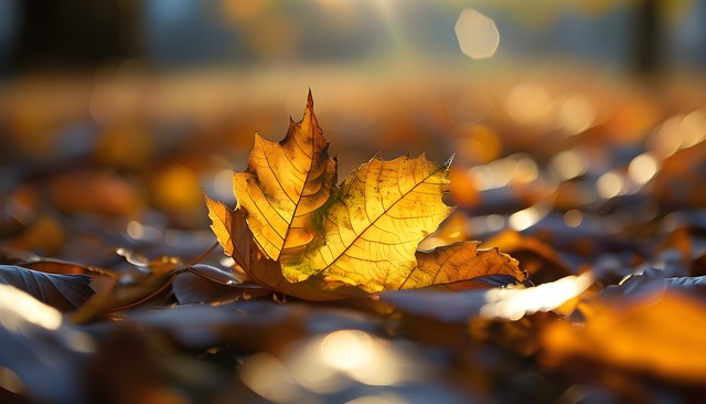秋天的枫叶在阳光下熠熠生辉,散落的叶子增添了自然的美感。