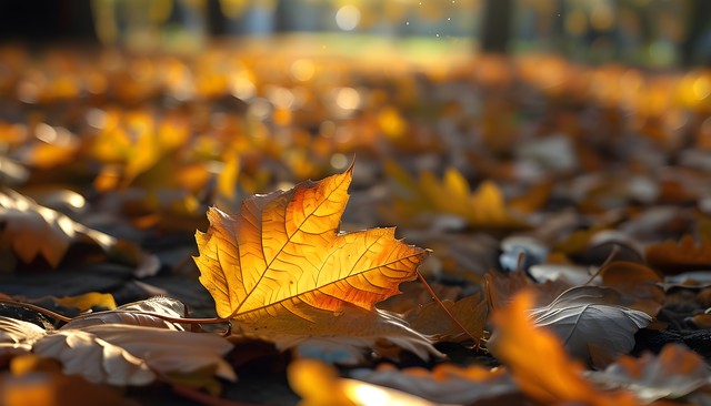 秋天的枫叶在阳光下熠熠生辉,散落的叶子增添了自然的美感。