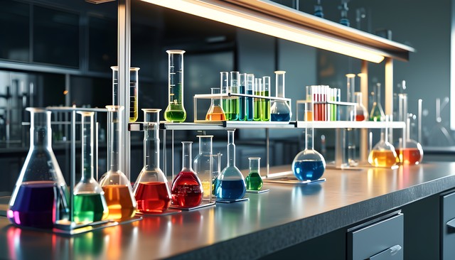 科学实验室内色彩缤纷的化学试剂瓶和仪器,阳光透过窗户照射进来。