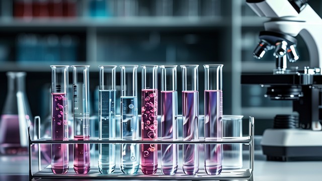 实验室中,试管排列整齐,显微镜下观察细胞组织,科技感十足。