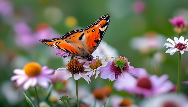 一只美丽的蝴蝶停在花朵上,周围盛开着五彩斑斓的花朵,展现自然的和谐美景。