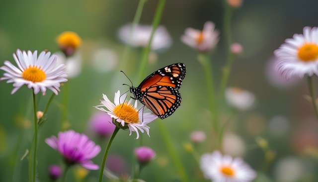 一只美丽的蝴蝶停在花朵上,周围盛开着五彩斑斓的花朵,展现自然的和谐美景。