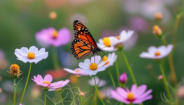 一只美丽的蝴蝶停在花朵上,周围盛开着五彩斑斓的花朵,展现自然的和谐美景。