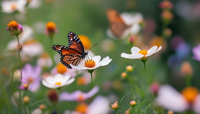 一只美丽的蝴蝶停在花朵上,周围盛开着五彩斑斓的花朵,展现自然的和谐美景。