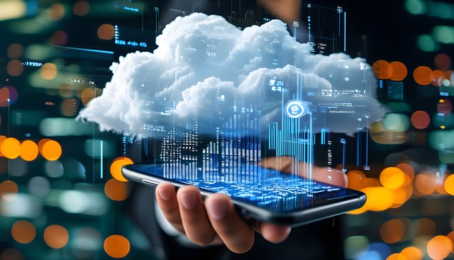 数字云计算和技术概念,手握平板灯光绚丽的虚拟场景。