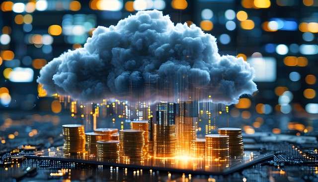 数字云计算和技术概念,手握平板灯光绚丽的虚拟场景。