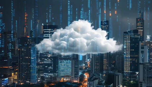 数字云计算和技术概念,手握平板灯光绚丽的虚拟场景。